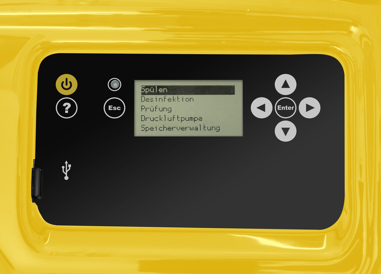 - protokolování - výsledky programů proplachování a zkoušek se ukládají ve zvoleném jazyce společně s datem, časem a číslem protokolu a je možné je ihned přenést pro účely dokumentace na zásuvnou paměť USB nebo na tiskárnu
